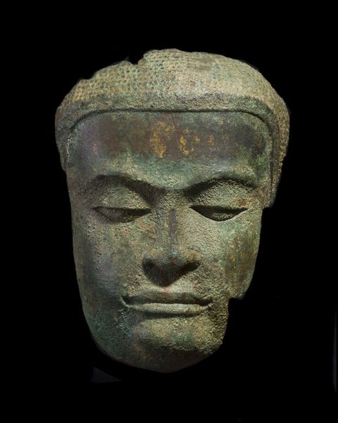 The surviving fragment of a statue of the Buddha reveals a serene face, apparently in a state of deep introspection.