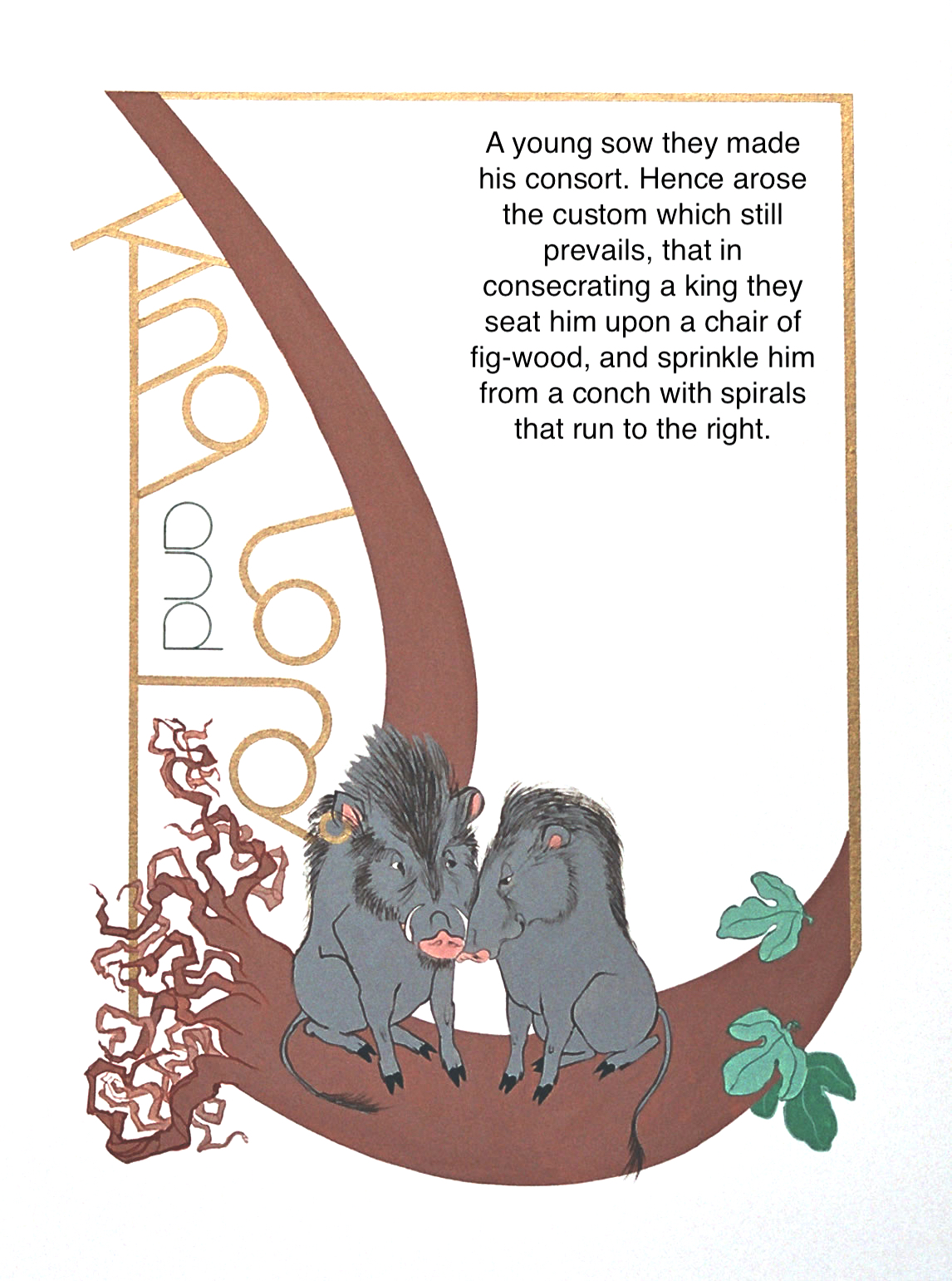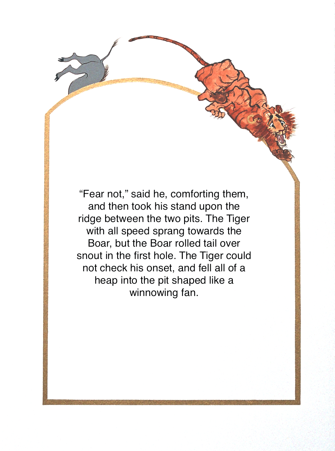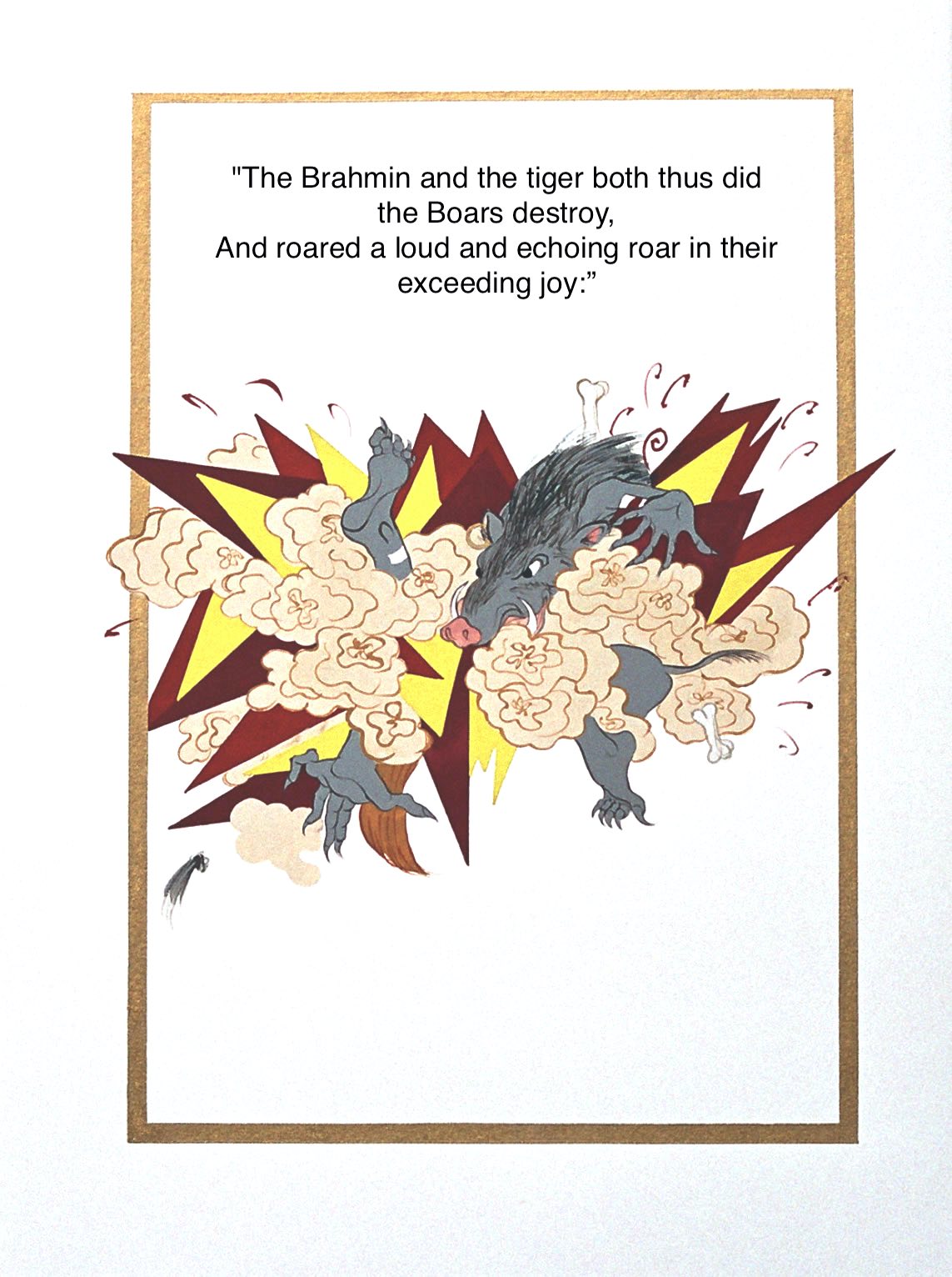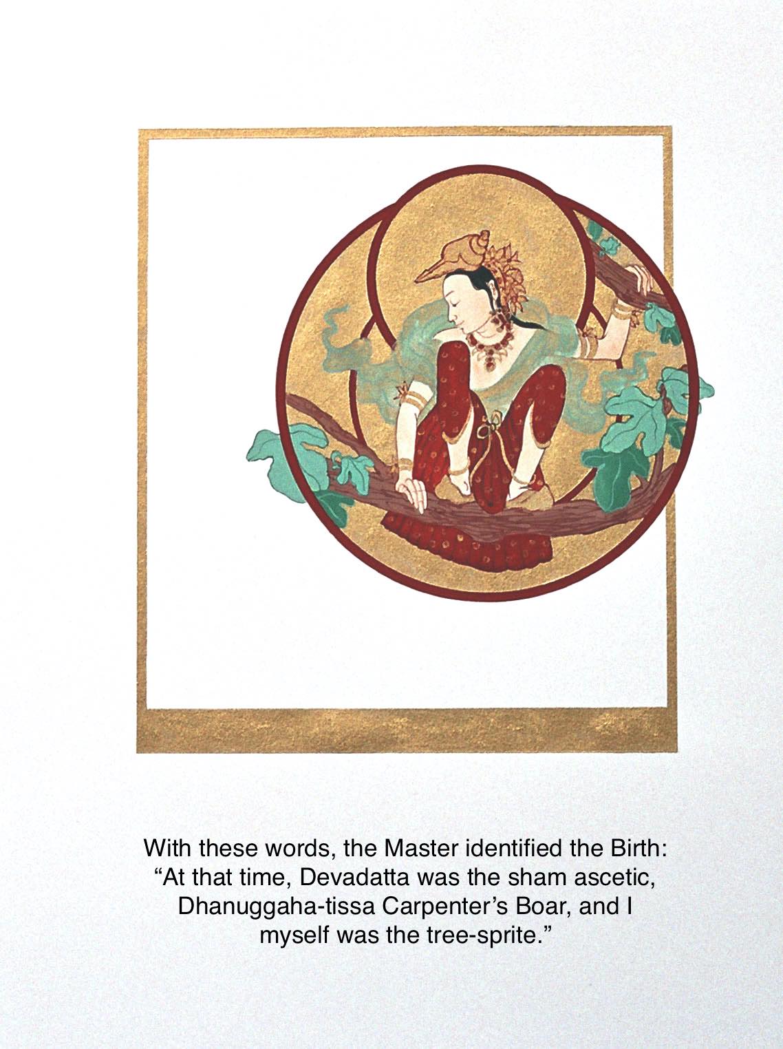 The final part of this Jātaka tale sees the Boar defeat the tiger and the sham ascetic, liberating the boars from danger, whilst the tree sprite reveals the details of who each character is in this birth.