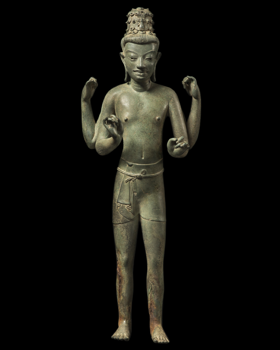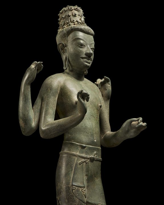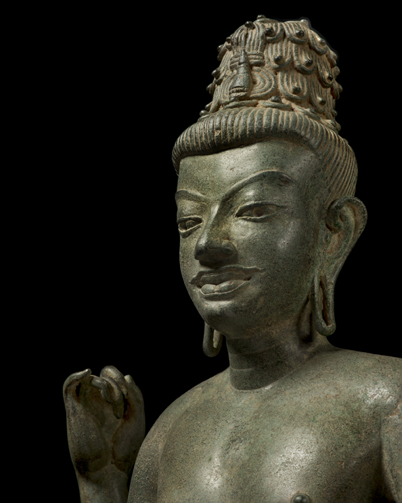The statue belongs to a group that are often referred to as being of “Prakhon Chai” style, indicating that they originate from the kingdom of Chanasa in Khorat, a mountainous region bordering eastern Thailand and Cambodia.  Buddhism spread over an enormous geographical area and was adopted by diverse groups of people who reworked it to suit their specific religious needs, with isolated communities evolving unorthodox beliefs that combined the faith with their existing, pre-Buddhist traditions.  This appears to have been the case in Chanasa where bodhisattva statues greatly outnumber images of the Buddha, implying that they may have been the focus of worship.  The beliefs that flourished in 7th to 9th century Chanasa seem to have been extremely localised as the statues found there are quite unlike any others.  In particular, Maitreya, the Buddha of the Future and Avalokiteshvara, the embodiment of compassion, are represented in the bronze images of Prakon Chai.  In every case, the bodhisattvas are represented as youthful ascetics, slender of limb, wearing simple garments and unadorned apart from their elaborately arranged chignon of matted locks, which becomes increasingly crown-like over the course of time.