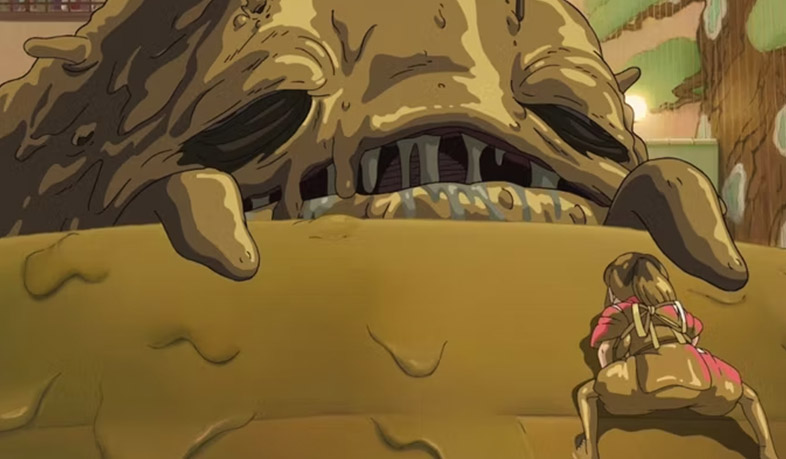 One of the more famous scenes in the film depicts a river spirit, disfigured into a form so toxic that its stench turns food sour and makes the eyes water. But this is a bathhouse and so Chihiro must clean the beast. It’s quite a process, and despite all the spirits of the bathhouse rushing to help clean the beast, in the end its left to Chihiro to do all the dirty work. Suddenly, there is an explosion of dirt. Plastic detritus and shopping trolleys spew from the beast, revealing the river spirit’s true form, a pure and wondrous spiritual being.
