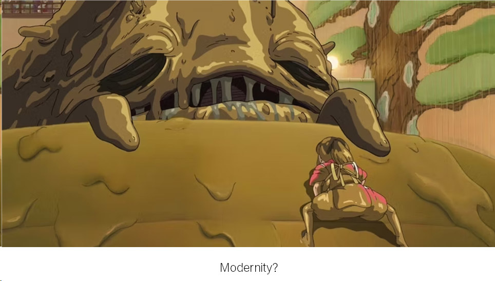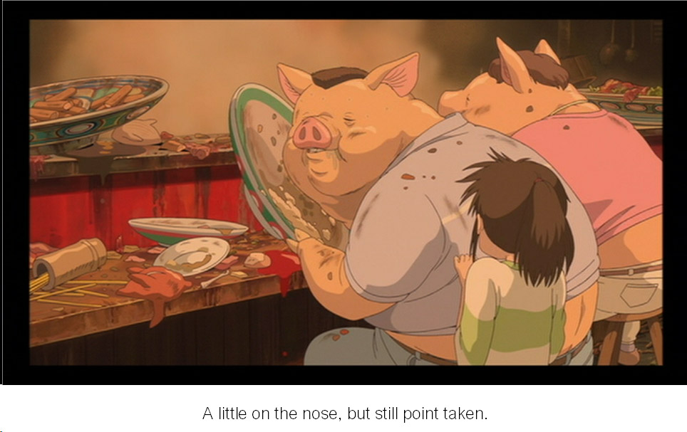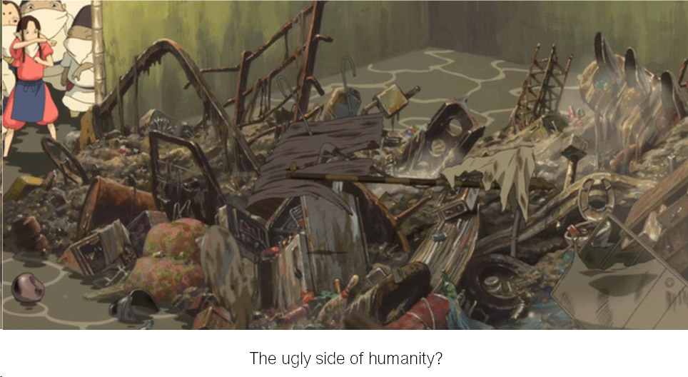 Think here of Chihiro. She knew that there is no such thing as a free lunch! Chihiro could see that human waste was turning the river spirit into a bloated mess and, remember, it is Chihiro’s parents who fell for the excesses of the food stalls, not Chihiro. Her parents make a beeline for the food which turns them into pigs, even while she tries to stop them.