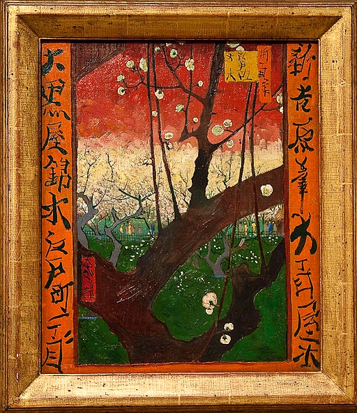 Flowering Plum Tree (After Hiroshige) is one of Van Gogh’s copies of Hiroshige prints, painted in 1887, and is one of his first departures from his usual style of painting. His attempts at rendering the Japanese calligraphy are not very accurate, however, as he had never studied the correct way to form the characters.