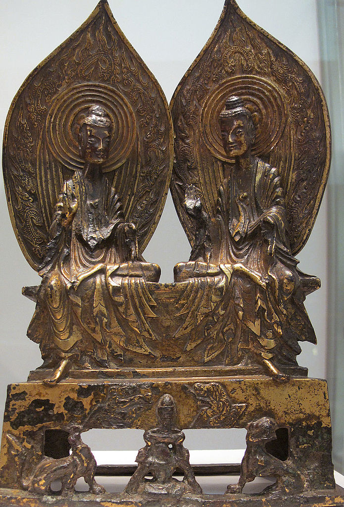 The Buddhas Prabhūtaratna and Shakyamuni seated side-by-side in the jeweled stupa. Bronze and gold stele, c. 518 CE, Northern Wei Dynasty. China