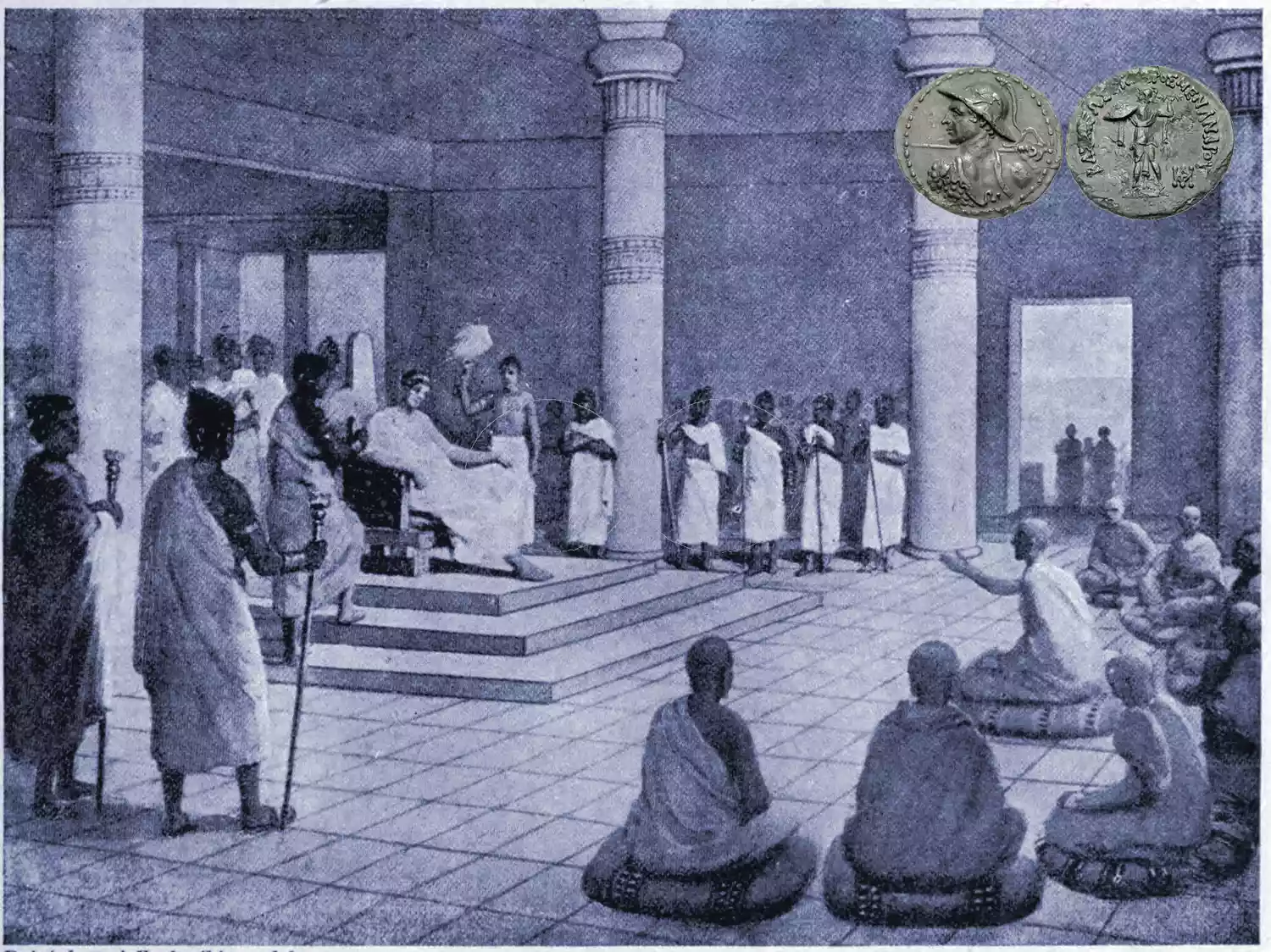 King Menander questions Nagasena, from a 19th century illustration.