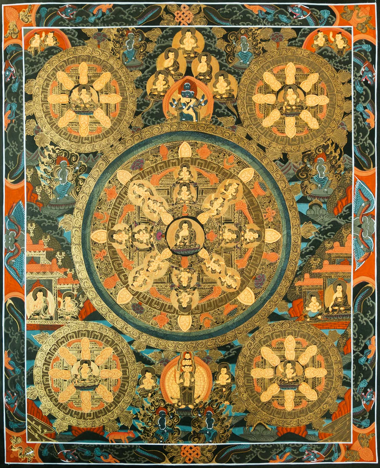 Vairocana is called the ‘Sun Buddha’ and is the ‘First’ (Skt. Adi) or ‘Primoridial’ Buddha and sits in the central place of the Five Wisdom Buddhas mandala surrounded by the four other Wisdom Buddhas who sit at the cardinal points. His name in Japanese is Dainichi Nyorai – The Buddha of Universal Illumination. His names and attributes are all connected with light and illumination, rays of life-giving power that initiate, nourish and sustain as the sun does all life on earth.