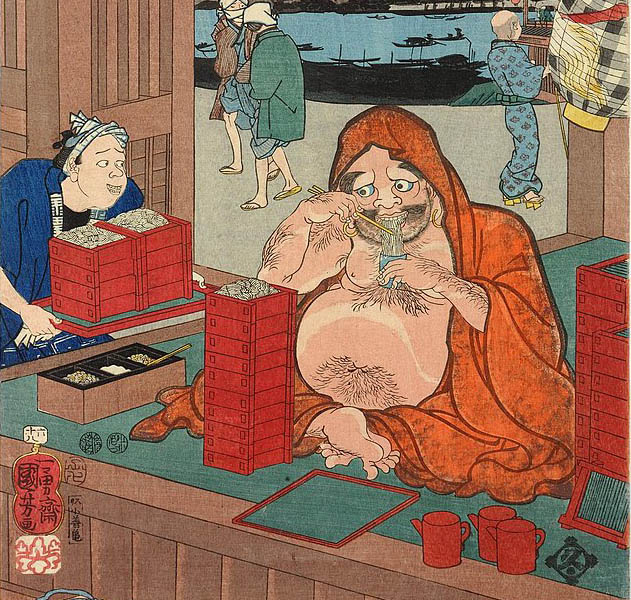 The Indian monk Bodhidharma (Jp. Daruma) eating mounded dishes of soba noodles.